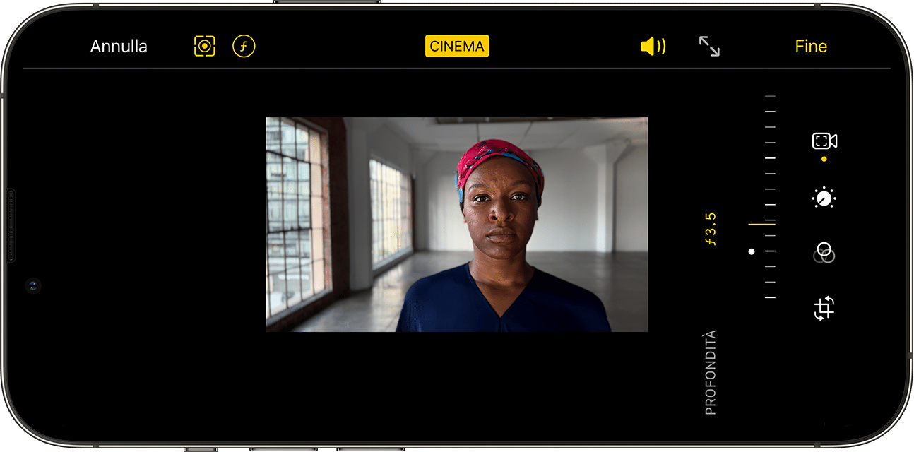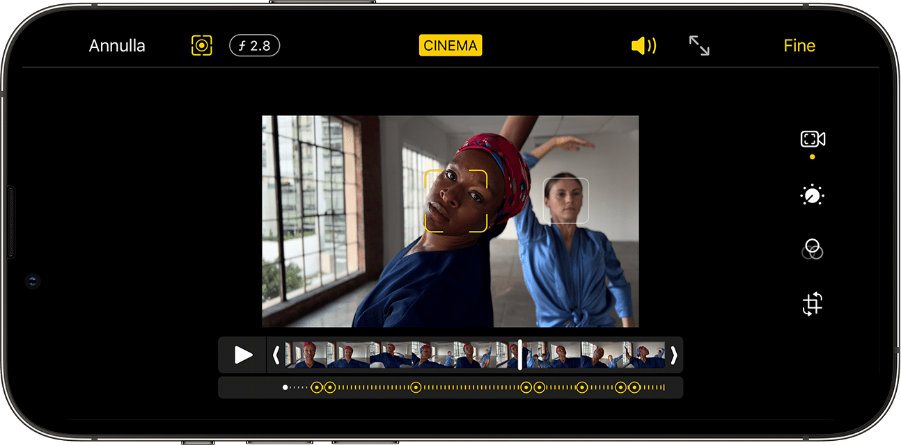 - Modalità Cinema, modalità Azione e Slow Motion per video al massimo: con la modalità Cinema, la fotocamera di iPhone può registrare video con una profondità di campo ridotta e aggiungere splendide transizioni della messa a fuoco per un aspetto cinematografico. Dopo aver registrato un video in modalità Cinema, puoi modificarlo nell’app Foto sui dispositivi supportati. Oltre alle modifiche standard che puoi apportare a tutti i video, puoi regolare la profondità di campo e i punti di messa a fuoco di un video registrato in modalità Cinema. Lamodalità Azione fornisce una migliore stabilizzazione durante la registrazione in modalità Video; in modalità Slo-mo, invece, il video viene registrato normalmente; quando lo si riproduce si vede l’effetto slow motion.