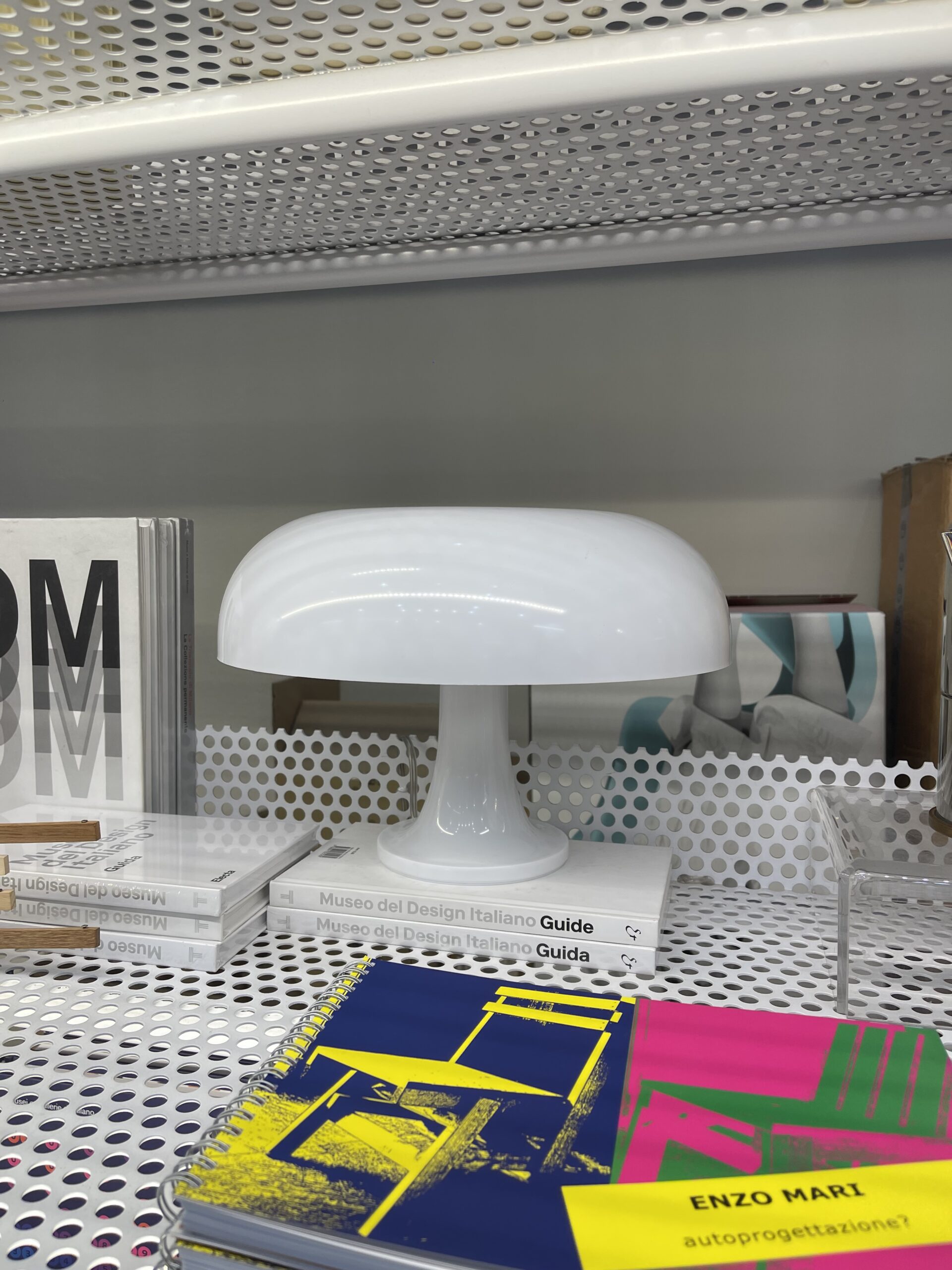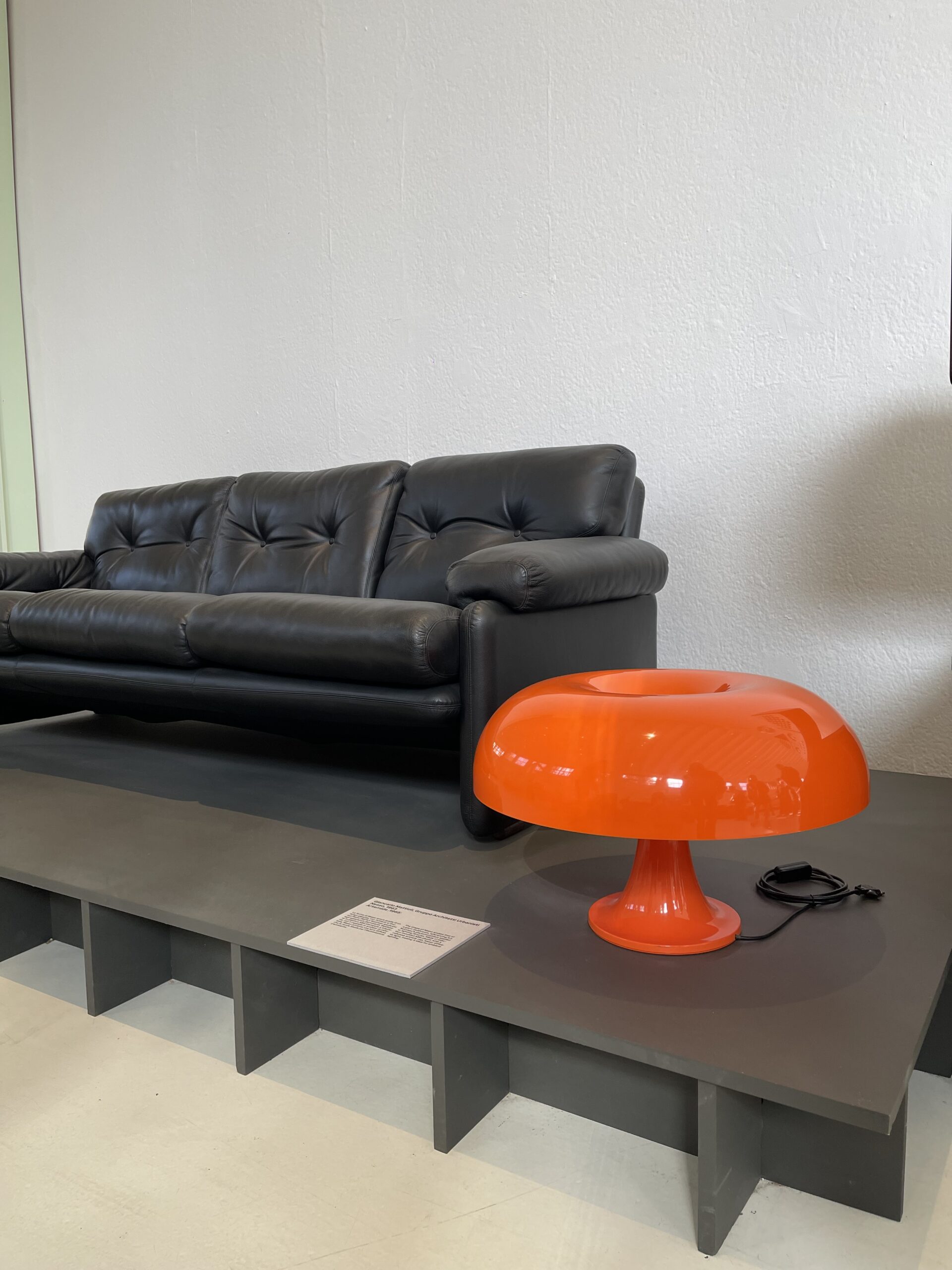 La lampada Nesso di Artemide, una delle lampade più in trend del momento, dalla riconoscibile forma di un fungo ma dai colori improbabili come l’arancione qui esposto. Questo oggetto fu disegnato negli anni 60, un periodo in cui si faceva forte uso di sostanze psichedeliche e di ritorno al contatto della natura e allo stesso modo la natura (in questo caso una lampada dalla forma di un fungo) viene portata dentro le case.