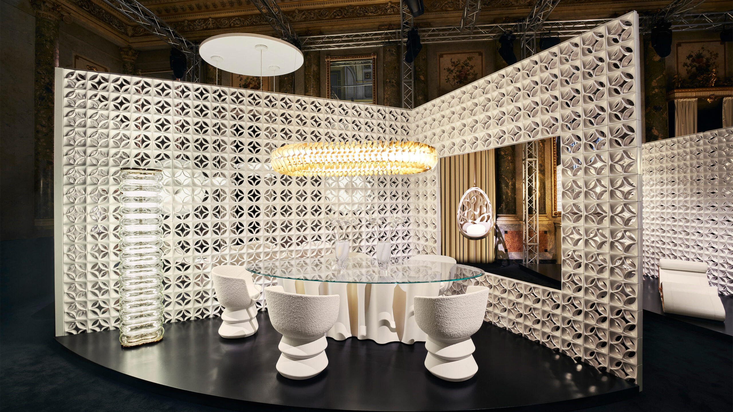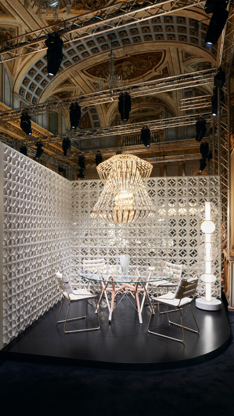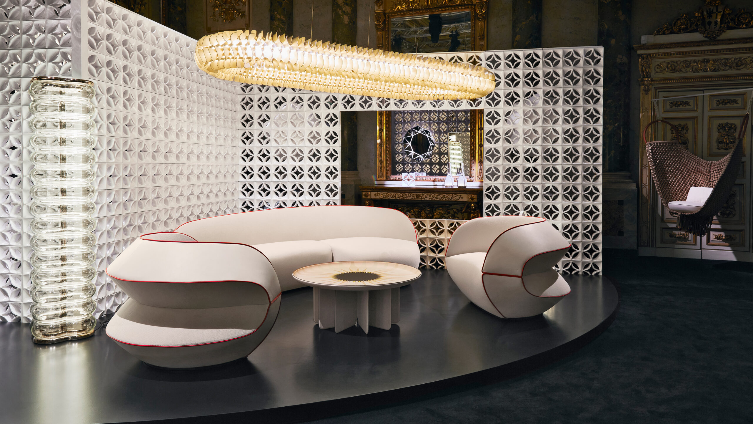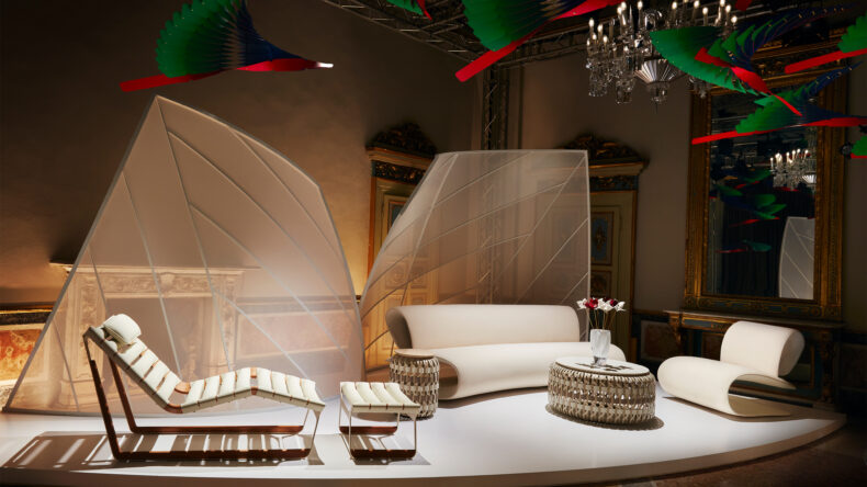 Infine, Origami Bowls sono oggetti d’arte pratici e semplicemente ingegnosi, ognuno dei quali è costituito da un singolo pezzo di pelle abilmente piegato per creare una forma tridimensionale mutevole. I designer londinesi Raw Edges hanno pensato alle due sedute Binda, elementi scultorei e imponenti; il loro design, ispirato alle linee curve di una pallina da tennis, ha una sorprendente angolarità arrotondata, accentuata dalla brillantezza della pelle lucida e da sedute avvolgenti in morbido velluto. La lampada Flower Tower dell’Atelier Biagetti è una colonna di 15 bolle di vetro a forma di fiore, creativa e scintillante, che fanno eco all’iconico Monogram di Louis Vuitton e sembrano fluttuare magicamente quando accese. Grazie alle tre aureole ondulate di vetro smerigliato la lampada Capeline del designer olandese Marcel Wanders crea uno specchio di luce delicatamente diffusa. Basket Table dei designer italiani Zanellato/Bortotto ha tre fasce orizzontali di pelle intrecciate in una base metallica a nido d’ape, dominato da un piano in pietra lavica smaltata e riflettente. La Flower Carafe e il Twist Glass di Studio Louis Vuitton sono realizzati a mano da artigiani veneziani e presentano forme fluide che si sviluppano in una spirale con la base a forma di fiore Monogram. I nuovi Bookend firmati dallo Studio Louis Vuitton in marmo e alluminio sono realizzati in modo da poter essere combiniati tra loro. Infine, l’ormai celebre seduta Cocoon di Campana sarà presentata in una nuovissima edizione Disco Ball, rivestita con un sorprendente mosaico argentato a specchio, mentre il divano Bomboca dei designer brasiliani è stato trasformato in un’abbagliante scultura dall’effetto metallico.