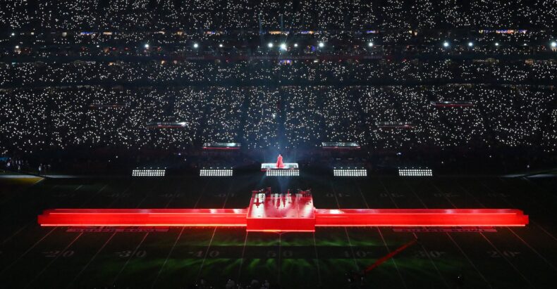Il grande show è stato co-prodotto da Apple e ha visto RiRi in piedi su una piattaforma mobile sospesa con una giacca rossa di Alaïa, una tuta personalizzata di Loewe e le nuove scarpe MM6 Maison Margiela x Salomon. Rihanna ha dato il via allo spettacolo con “Bitch Better Have My Money”, proseguendo con alcuni dei suoi più grandi successi dance come “Where Have You Been”, “Only Girl (In the World)”, “We Found Love” e un mix esteso di “Rude Boy”. Alla partita hanno partecipato molti ospiti, ma il sostegno più grande è arrivato dalla maglietta di Cara Delevingne.