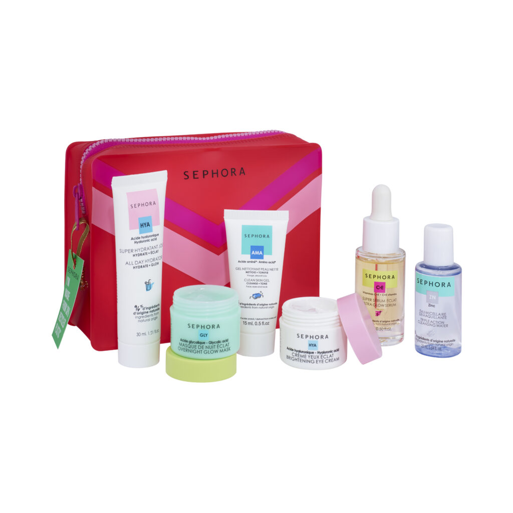 WHAT: Kit mini size di prodotti essenziali per la cura del viso con: Crema contorno occhi illuminante 20 ml, Super siero illuminante 15 ml, Acqua micellare struccante 25 ml, Gel detergente pelle pulita 15 ml, Super idratante giorno 30 ml, Maschera notte illuminante 20 ml