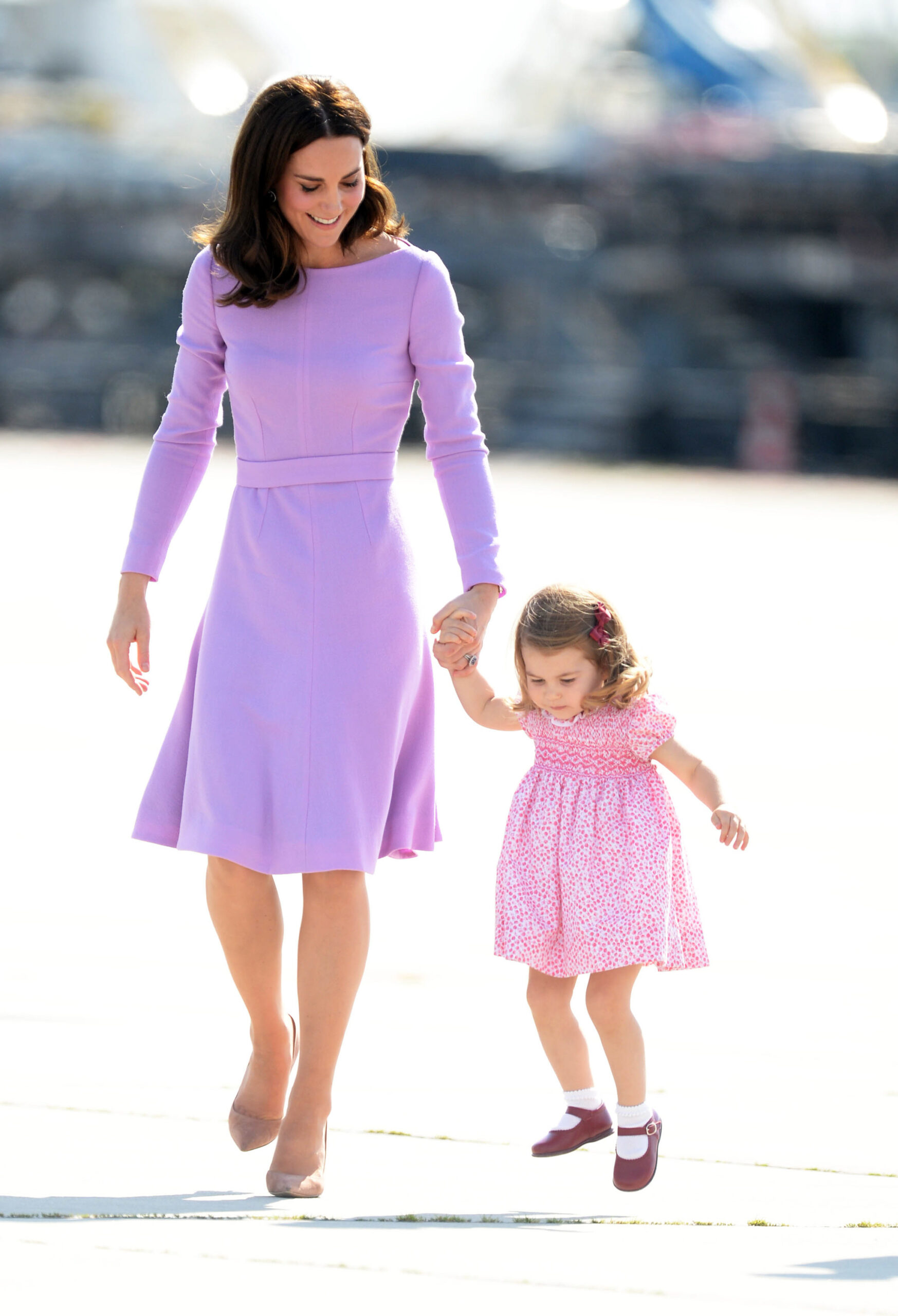 - HAMBURG, GERMANY – JULY 21: (NO UK SALES FOR 28 DAYS FROM CREATE DATE) Catherine, Duchess of Cambridge and Princess Charlotte of Cambridge depart from Hamburg airport on the last day of their official visit to Poland and Germany on July 21, 2017 in Hamburg, Germany. (Photo by Pool/Samir Hussein/WireImage)