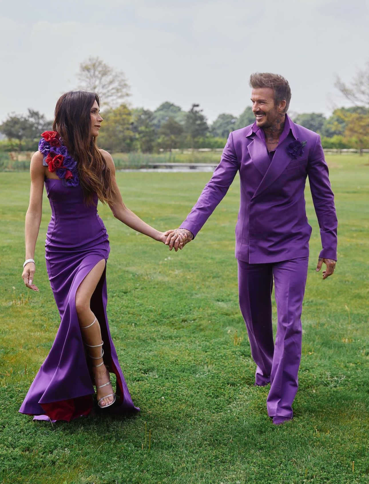 Come dimenticarsi quella meravigliosa giornata, quando l’ex Spice Girl e l’allora campione di calcio hanno giurato amore in una cerimonia da sogno che attirando l’attenzione globale. Seduti su due troni, mano nella mano, vestiti in abiti che hanno fatto storia: lei con un elegante abito monospalla a sirena, decorato con una cascata di fiori e uno spacco, completato da sandali color argento; lui in un impeccabile completo a doppiopetto e pantaloni a zampa. Ovviamente, entrambi in viola – matchy matchy as always!