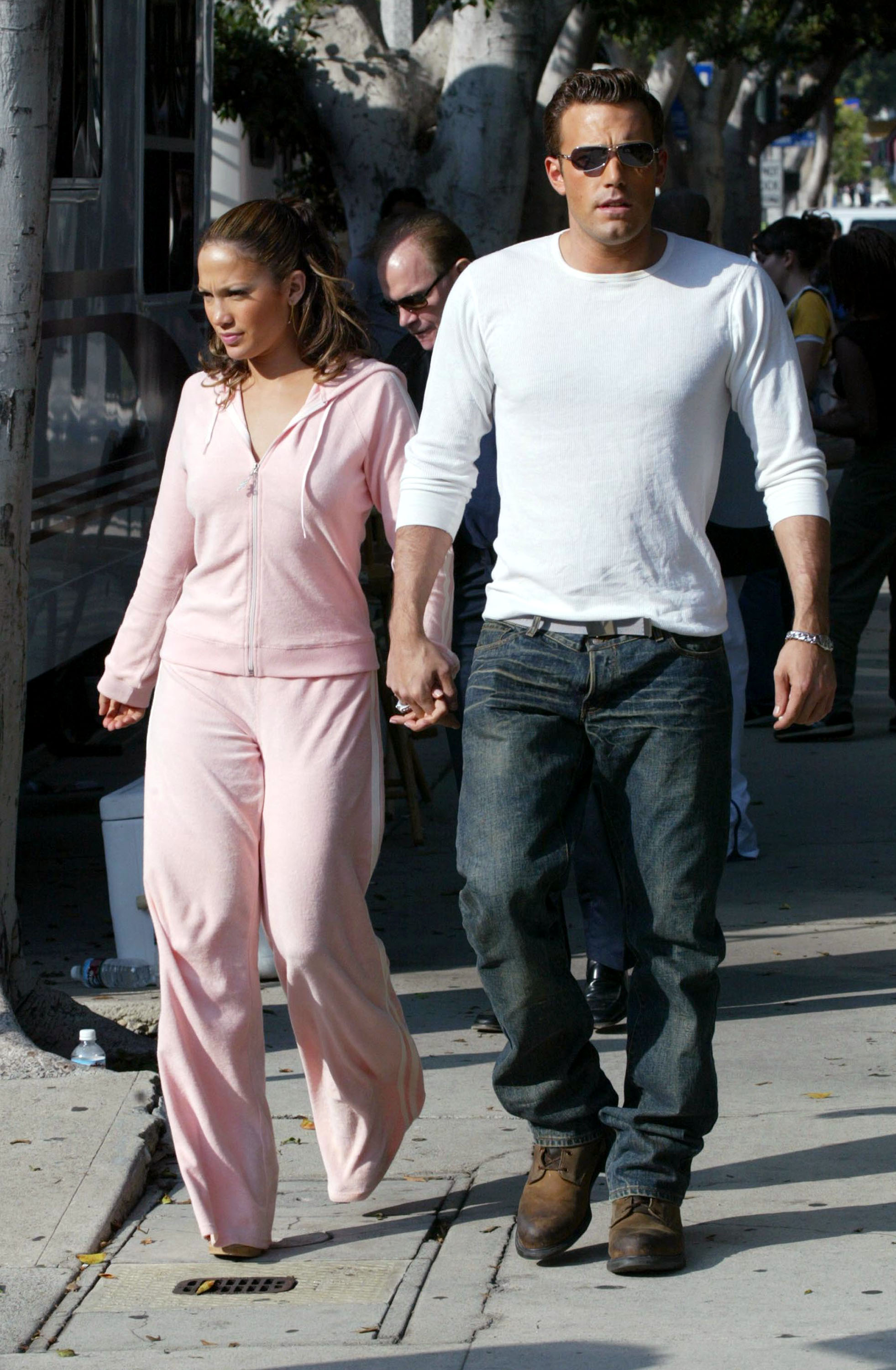 - BEVERLY HILLS, CA – OCTOBER 20: Actress/singer Jennifer Lopez and actor Ben Affleck hold hands while filming her new music video at Barefoot restaurant on October 20, 2002 in Beverly Hills, California. (Photo by Mel Bouzad/Getty Images)