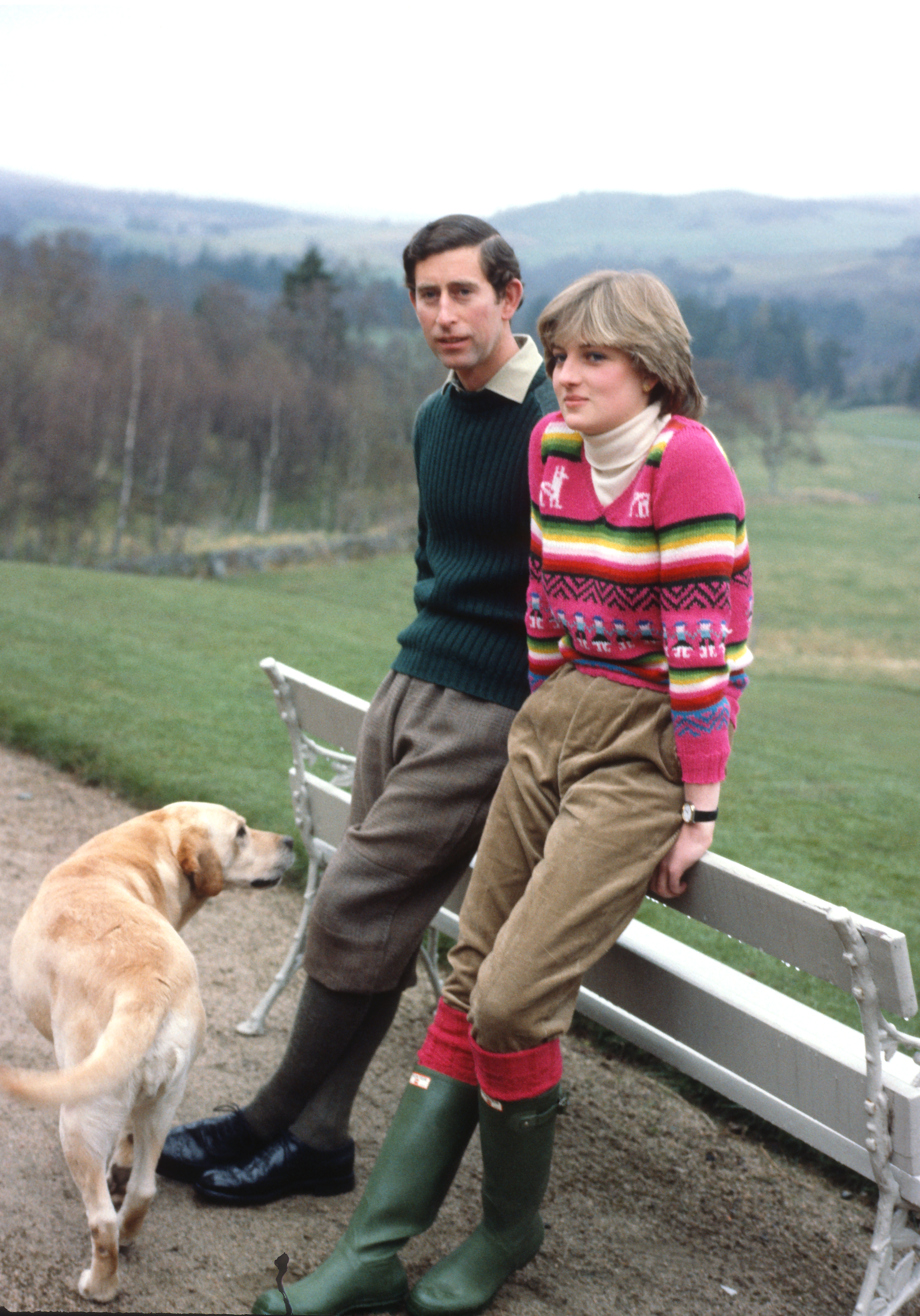 - BALMORAL, SCOTLAND – MAY 06: Prince Charles, Prince of Wales and his fiance Lady Diana Spencer, wearing an Inca jersey jumper with green corduroy trousers and Hunter wellies, pose for a photocall with their dog Harvey at the estate at Craigowen Lodge, ahead of their July 29, 1981 wedding, on May 6, 1981 in Balmoral, Scotland. (Photo by Anwar Hussein/Getty Images)