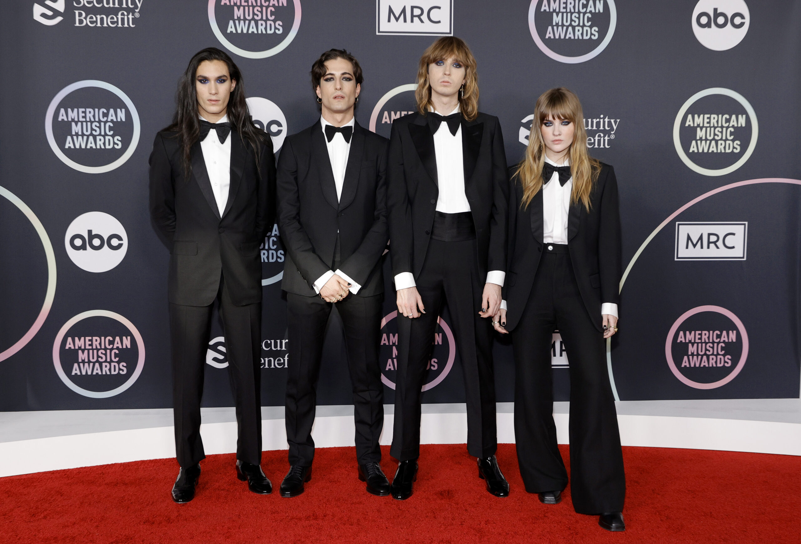 - LOS ANGELES, CALIFORNIA – NOVEMBER 21: (L-R) Ethan Torchio, Damiano David, Thomas Raggi, and Victoria De Angelis of the band Måneskin attend the 2021 American Music Awards at Microsoft Theater on November 21, 2021 in Los Angeles, California. (Photo by Amy Sussman/Getty Images)